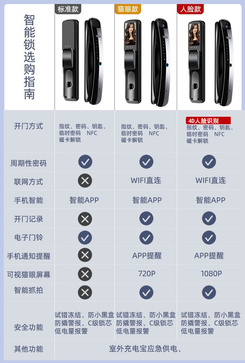 开锁方式:APP,刷卡,钥匙,密码,指纹