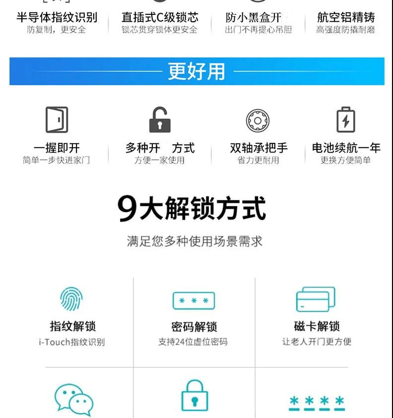 开锁方式:APP,刷卡,钥匙,密码,指纹