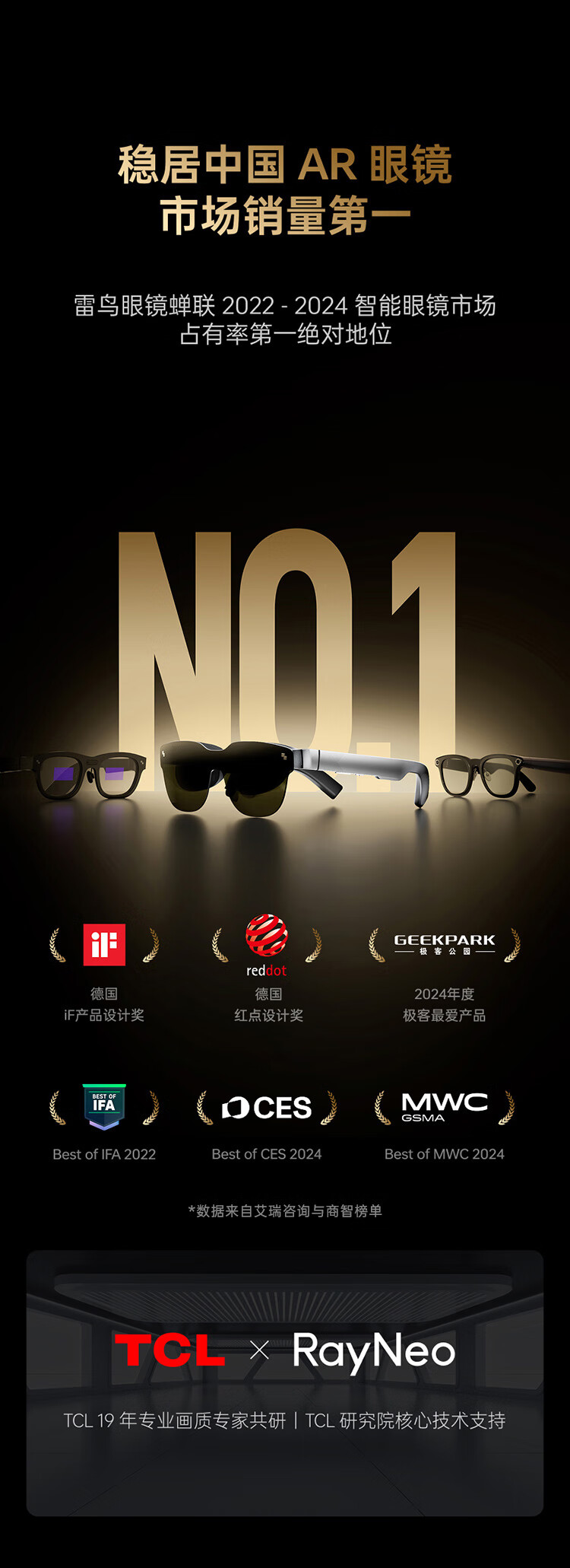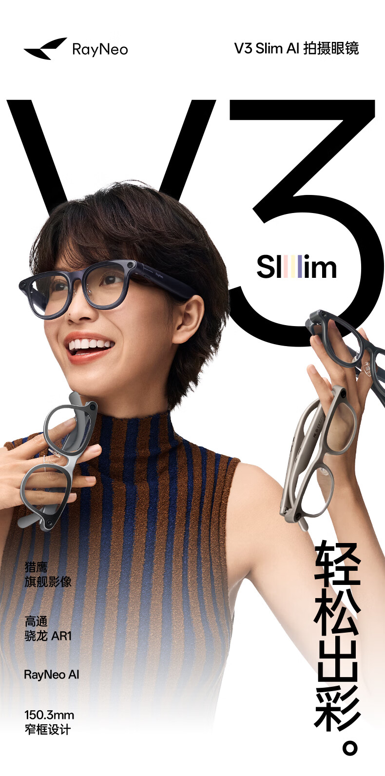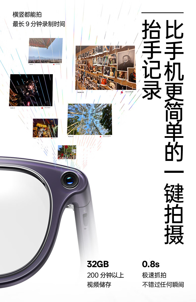 雷鸟RayNeo V3 Slim AI拍摄智能眼镜 蓝牙眼镜 镜架非平光镜 墨镜款 (含充电盒)